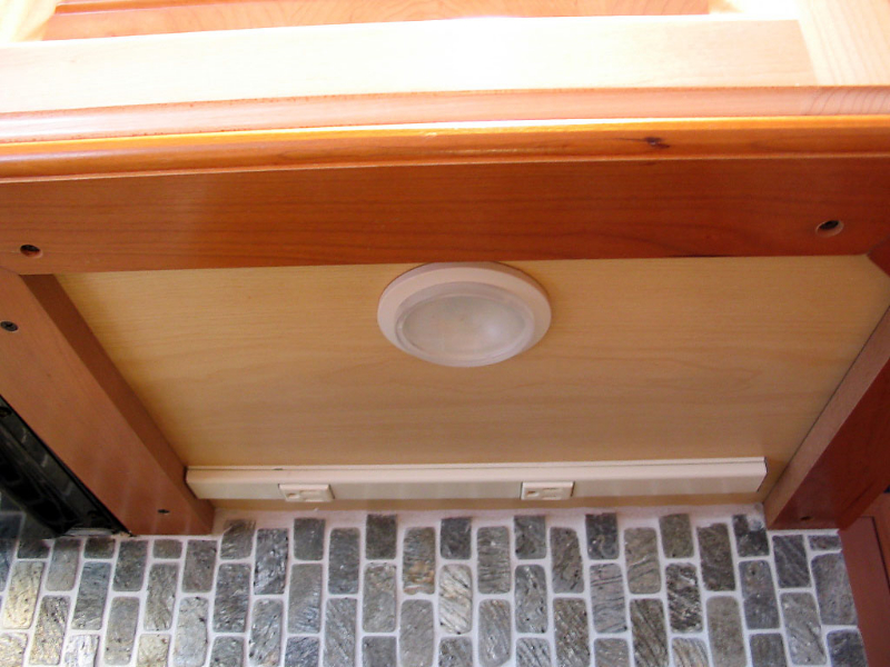 (Below: Cabinet bottom machined to conceal light and wiring. Light Rail Molding added to further conceal body of light.)